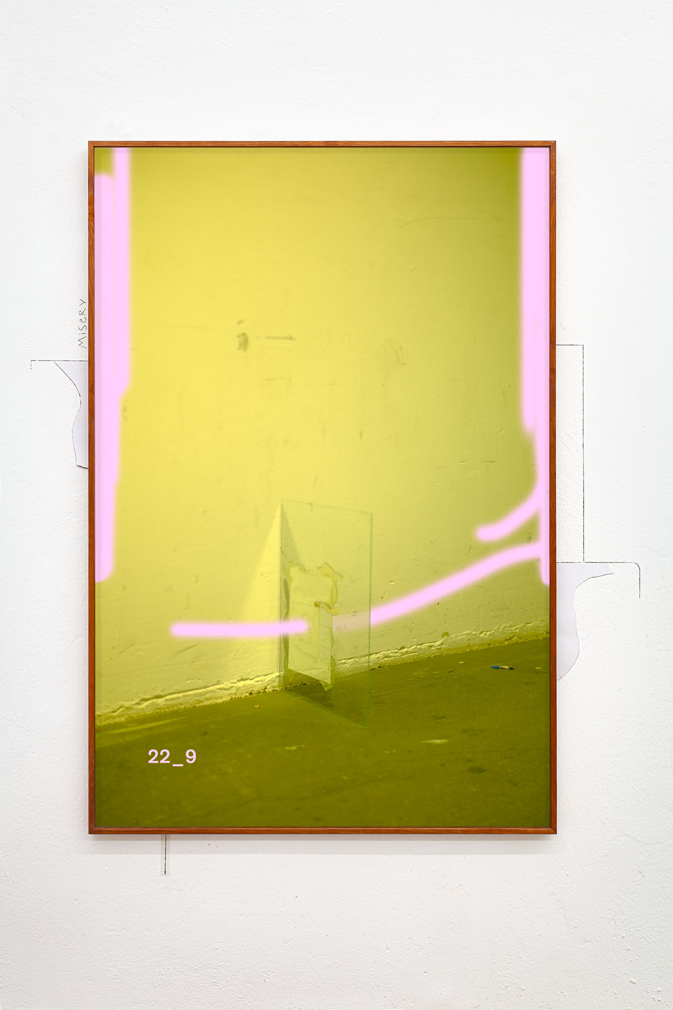 Martin Widmer, “Transfered photograph”n°17, (Photographies diluées transférées sur carton, colle, crayon, plastique, texte, cadre, carton), 2024